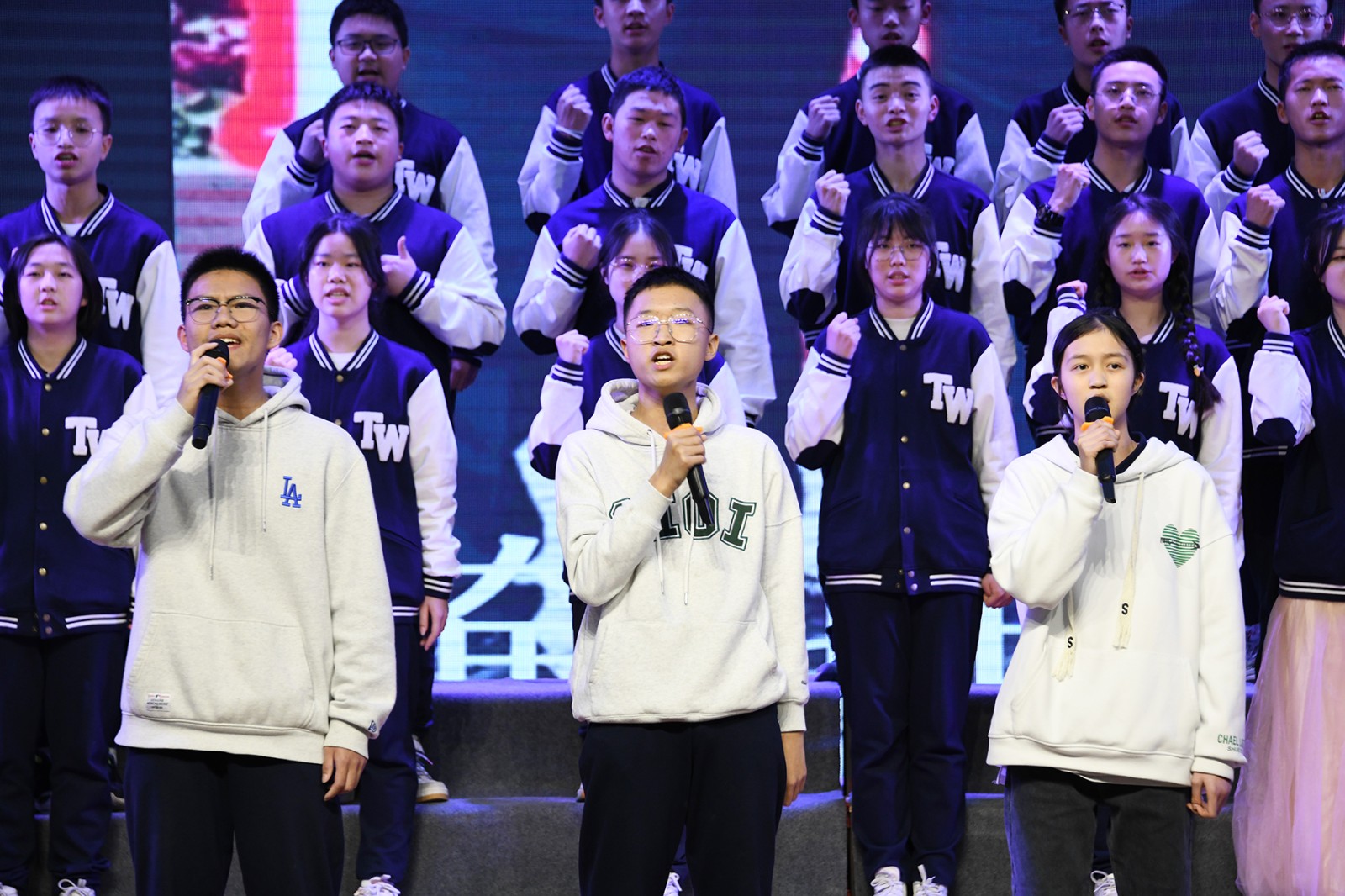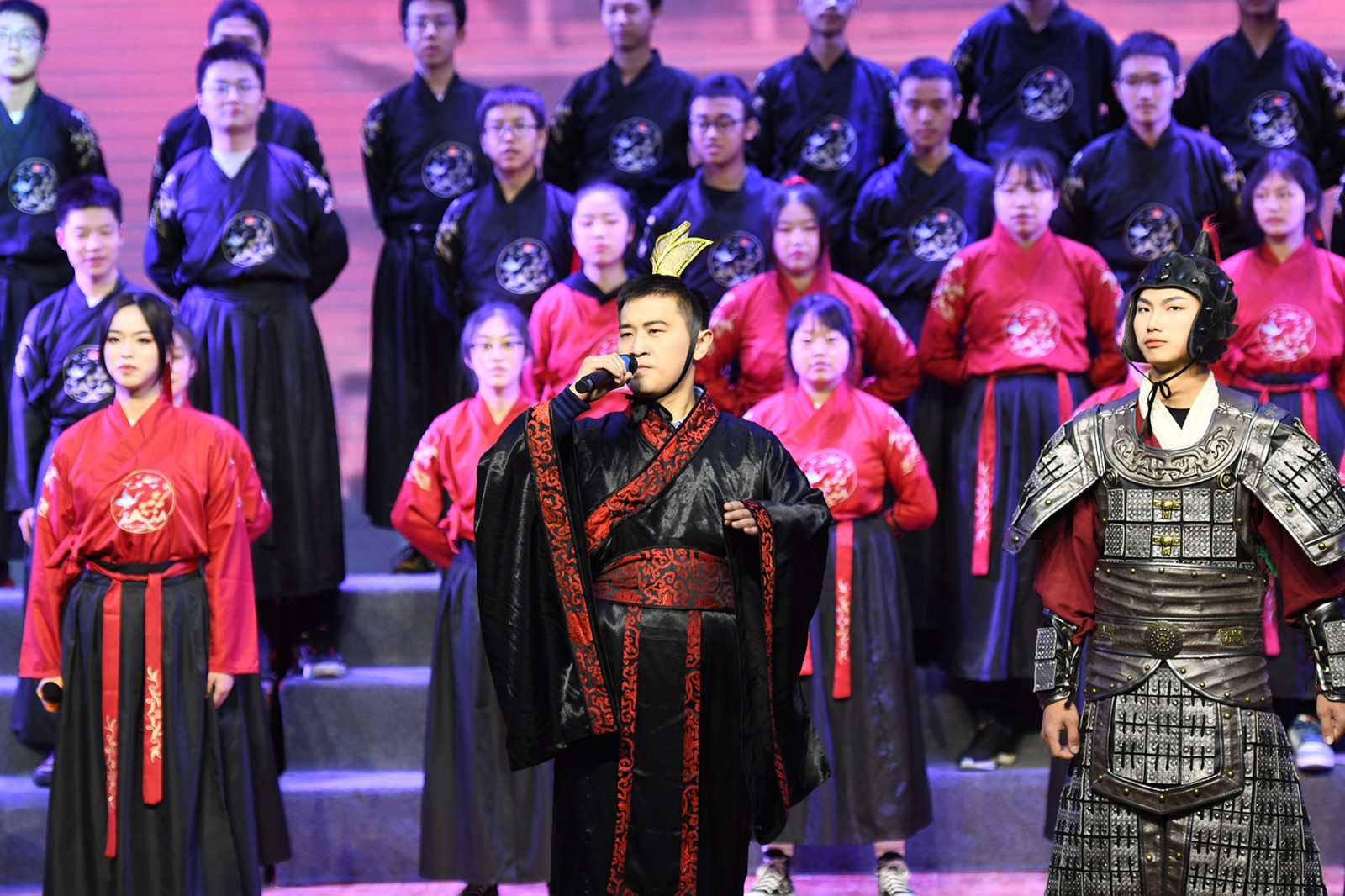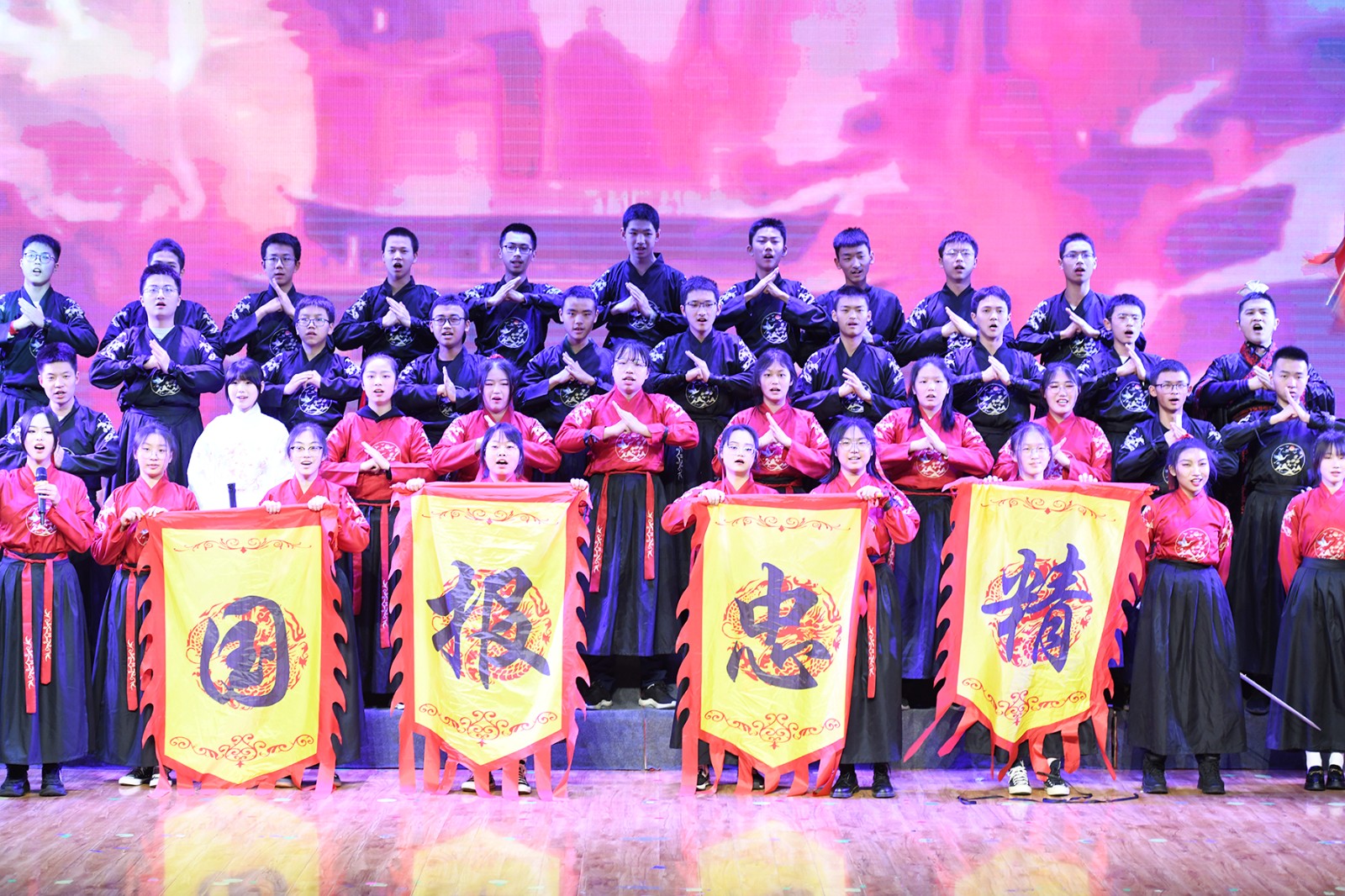 华彩出群英,诗韵有国风!这里绵延着古风,荡涤着儒雅书香,《兰亭序》《杨花落尽子规啼》《木兰诗》《青花瓷》余韵悠远;这里依偎着现代,寻觅着精神依托,《追光者》《夜空中最亮的星》《一路生花》《沸腾的心》情深意长;更有《精忠报国》者,唱出了同学们的气势、唱出了同学们激情、唱出了同学们勇往直前的心!